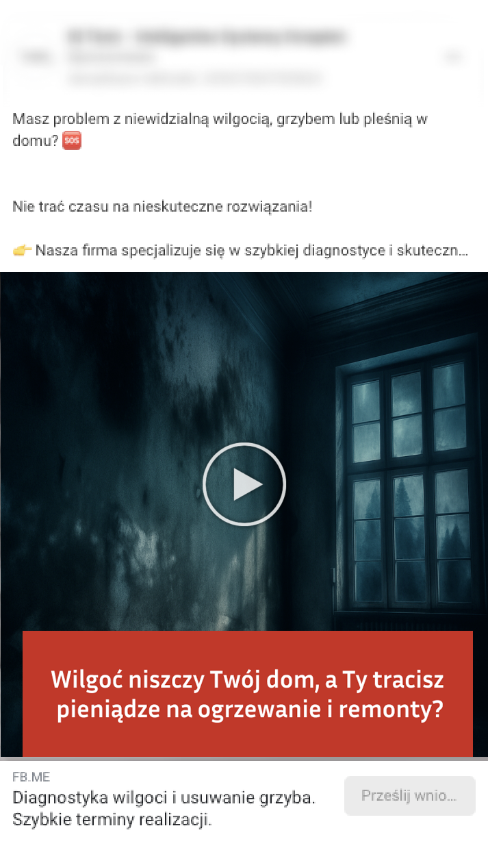 To właśnie w ramach tych testów odkryliśmy unikalny format reklamy wideo prezentujący skutki ukrytych problemów, takich jak wilgoć czy grzyb, zarejestrowane kamerą termowizyjną. Ten innowacyjny film, którego początkowa, niemal złowroga atmosfera natychmiast przyciągała uwagę okazał się niezwykle skuteczny. Znacząco obniżając koszt pozyskania leada (z 45,35 zł do 16,20 zł) i wyróżniając firmę na tle konkurencji.