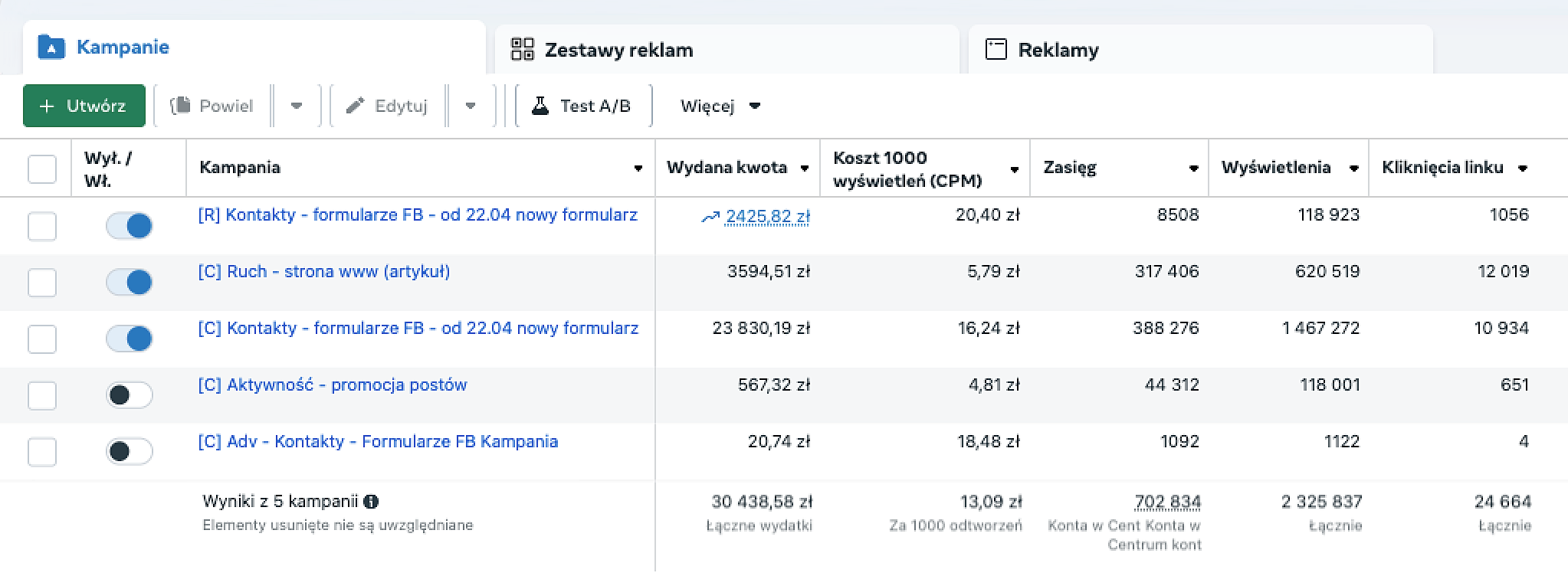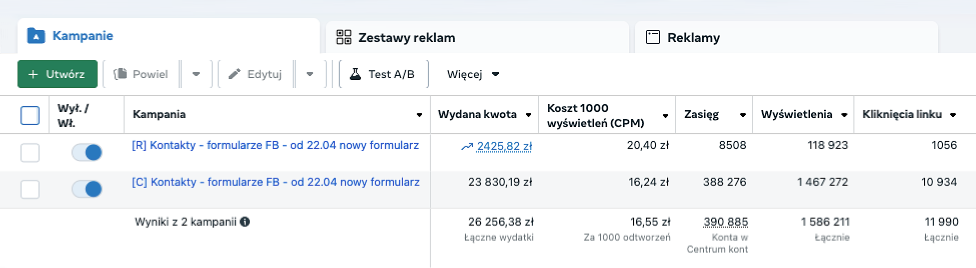 Nieustannie testowaliśmy również różne formaty formularzy (krótsze i dłuższe) zarówno na stronie, jak i w Meta Ads, aby zoptymalizować współczynnik konwersji.