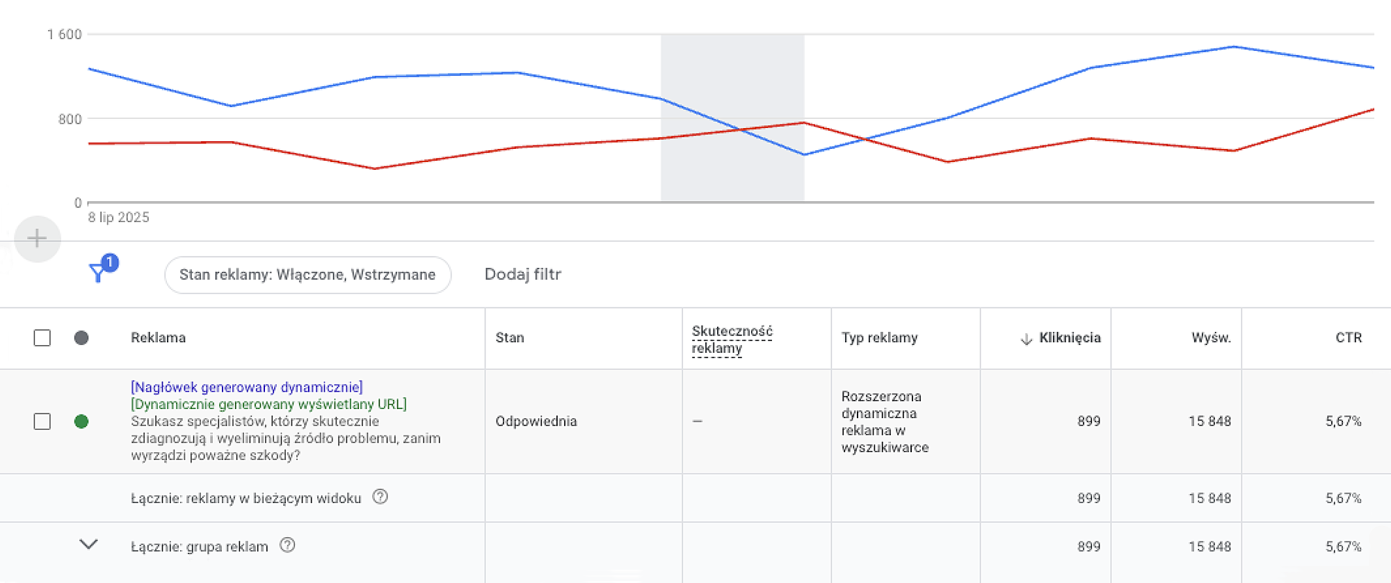 Kluczowym elementem było codzienne monitorowanie i optymalizacja słów kluczowych, w tym eliminowanie tych generycznych, które generowały nieefektywny ruch i mogłyby obniżyć efektywność działań reklamowych w Google.