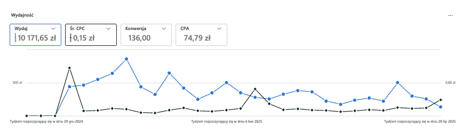 W celu dalszej dywersyfikacji źródeł pozyskiwania kontaktów i zwiększenia skali działania, po dogłębnej analizie potencjału rynkowego, włączyliśmy do strategii kampanie w Microsoft Ads. Ten krok okazał się strzałem w dziesiątkę – kanał ten, szczególnie w obszarze kampanii graficznych i remarketingowych, zaczął generować wysokiej jakości leady przy wyjątkowo konkurencyjnych kosztach, umacniając naszą kompleksową strategię pozyskiwania klientów.