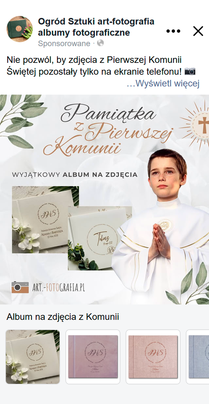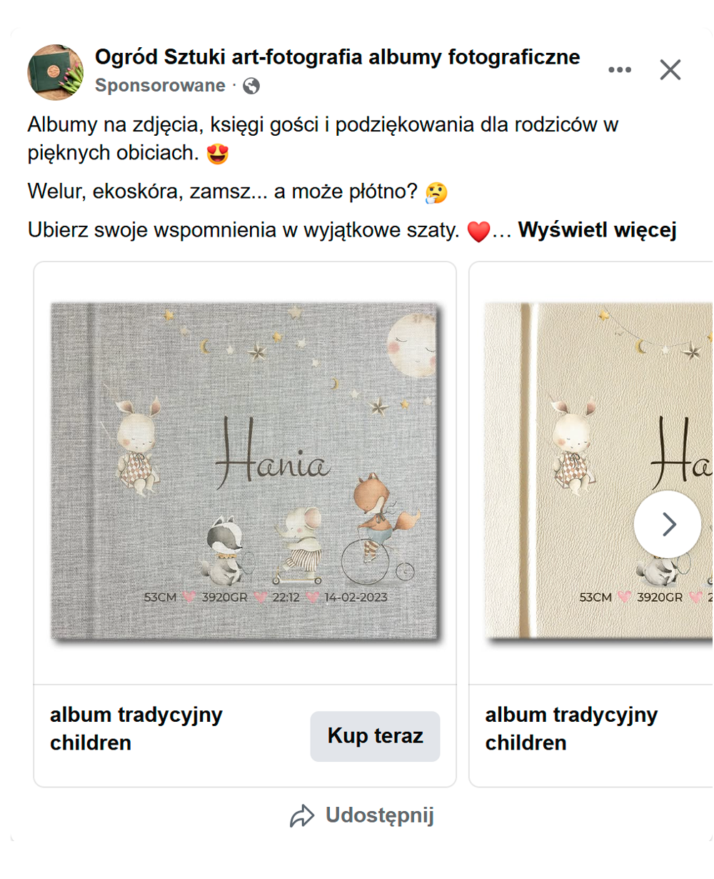 Największy potencjał sprzedażowy Art-Fotografii tkwił w zakupach związanych z konkretnymi wydarzeniami - śluby, komunie czy baby shower. Dlatego w kampaniach Meta Ads zastosowaliśmy podejście oparte na okazjach: każda z nich miała osobno dopasowaną kreację, komunikat i zestaw reklamowy.