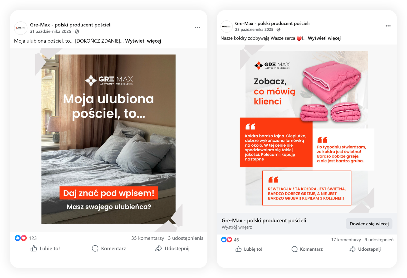 Równolegle do tych działań systematycznie rosła społeczność marki — fanpage Gre-Max zwiększył się o ok. 7 500 obserwujących, a profil na Instagramie o ok. 800 osób, co dało nam realną bazę odbiorców pod późniejsze działania sprzedażowe.