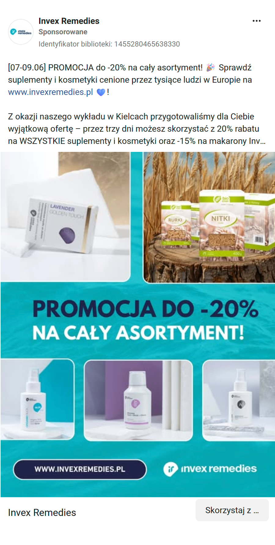 Poza okresami intensywnych promocji nie wyłączaliśmy działań całkowicie. Nadal prowadziliśmy działania mające na celu generowanie sprzedaży w sklepie oraz utrzymanie stałej widoczności. Równolegle regularnie promowaliśmy posty edukacyjne z fanpage'a, aby konsekwentnie budować autorytet i wspierać wizerunek marki Invex Remedies.