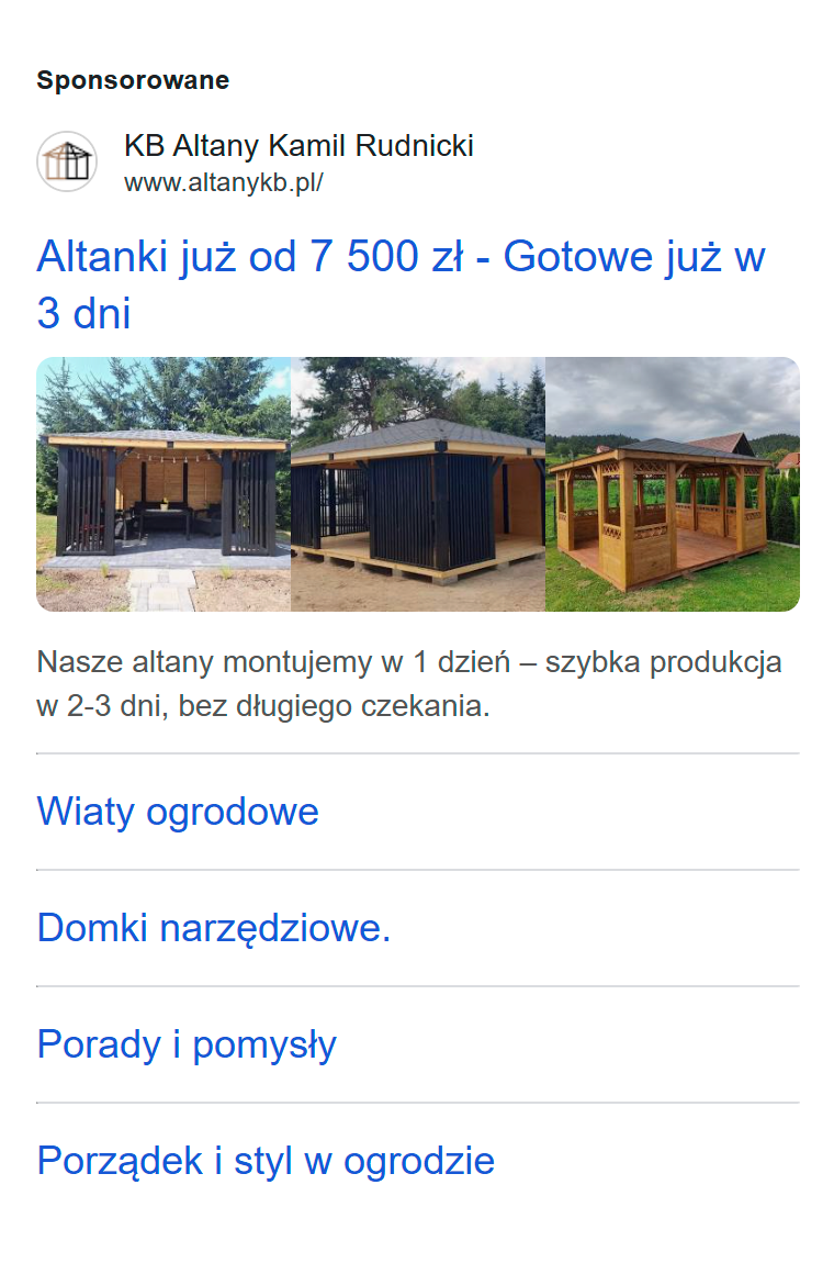 - Podkreślenie mocnych stron klienta: W tekstach reklamowych jasno komunikowaliśmy to, co wyróżnia KB Altany: konkurencyjne ceny, szybką realizację i dostępność 7 dni w tygodniu. To pozwoliło przyciągnąć uwagę zdecydowanych klientów i zbudować przewagę nad konkurencją.