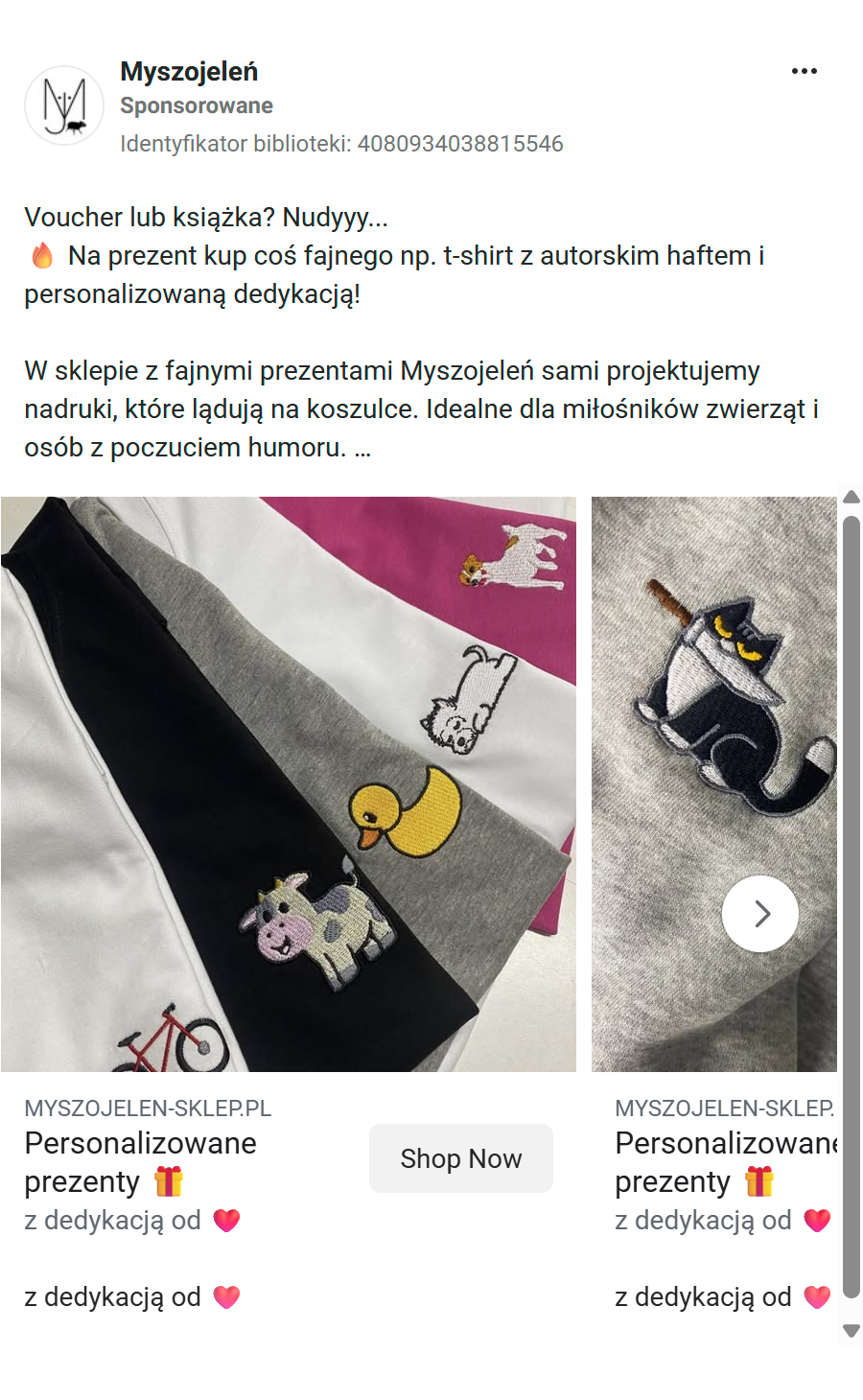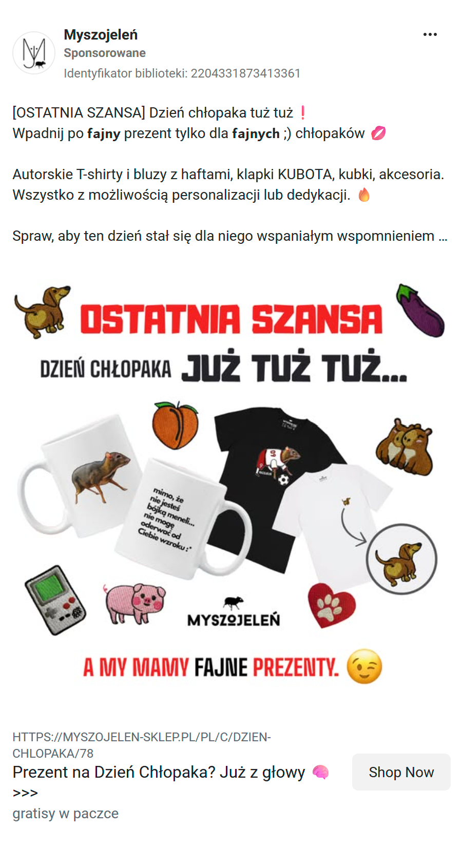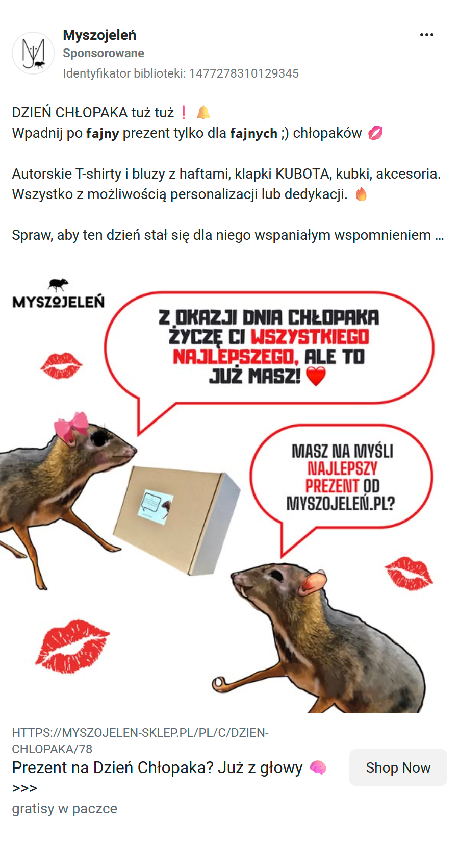 Branża prezentowa działa impulsowo – klient kupuje „na okazję”, często kierując się humorem. Dlatego przygotowaliśmy kreacje, które mówiły językiem społeczności Myszojelenia: lekkim, memowym, zgodnym z charakterem marki.