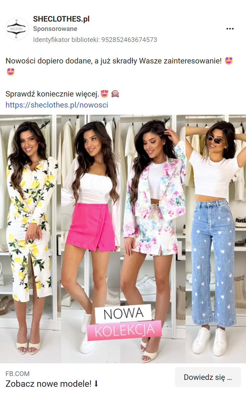 Z czasem wypracowaliśmy najbardziej skuteczne formaty, m.in. minimalistyczne grafiki prezentujące kolaż kilku zdjęć modelki na jasnym tle oraz czytelny komunikat o nowej kolekcji. Połączenie tych form z regularnym rytmem premier (co 7–10 dni) znacząco zwiększyło efektywność kampanii, umożliwiło dynamiczne reagowanie na trendy i utrzymało spójność wizualną marki.