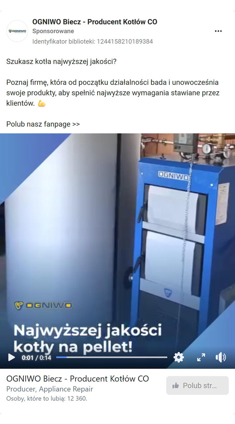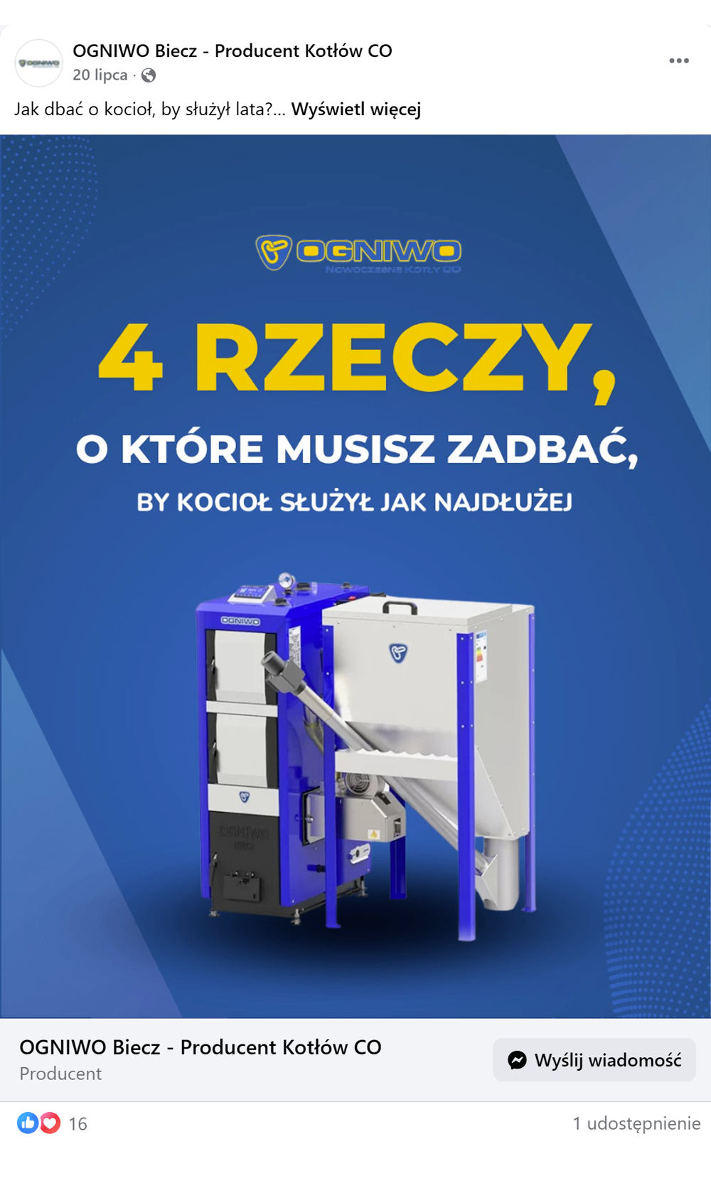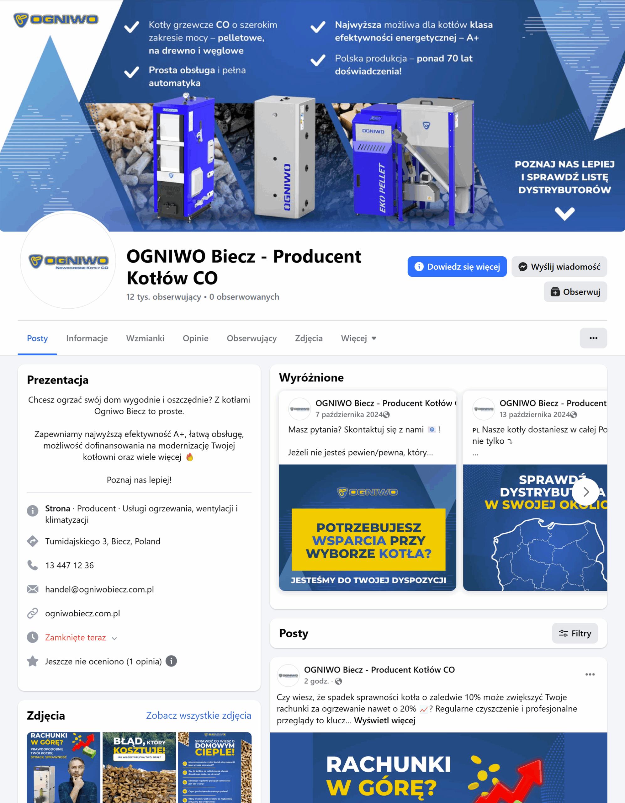 Równolegle z kampanią reklamową, dbamy o regularną i wartościową komunikację na profilu firmy SMO “Ogniwo”. Skupiliśmy się na treściach, które pozycjonowały markę jako eksperta – od porad dotyczących wyboru kotła, po prezentację przewag technologicznych ich produktów. Dzięki temu każde pozyskane polubienie stawało się realną inwestycją w budowę zaangażowanej społeczności, a nie tylko statystyką w raporcie.