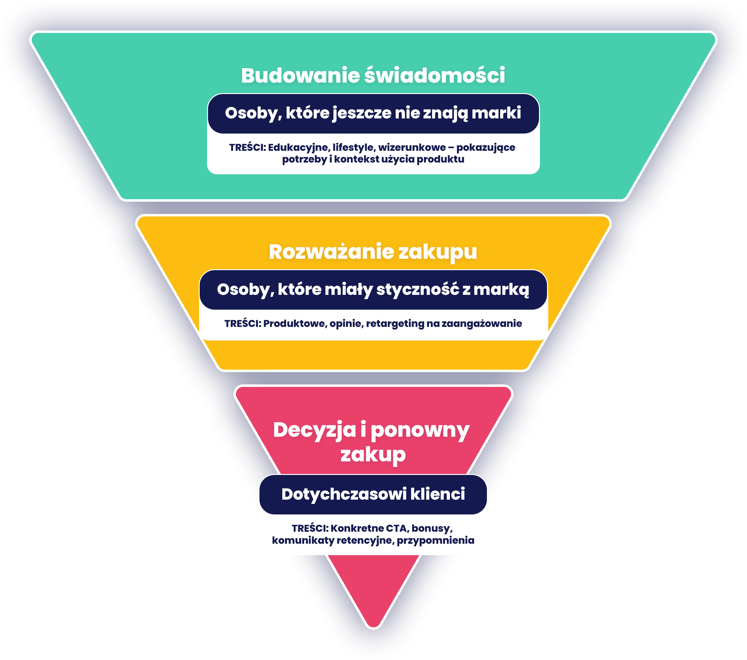 Strukturę lejka oparliśmy na realnych etapach procesu zakupowego: od budowania świadomości, przez edukację i rozważanie zakupu, aż po decyzję i ponowny zakup. Każdy poziom miał przypisane konkretne cele, wskaźniki i typy treści - co pozwoliło nam zarządzać kampanią z dużą precyzją i szybko wyciągać wnioski.