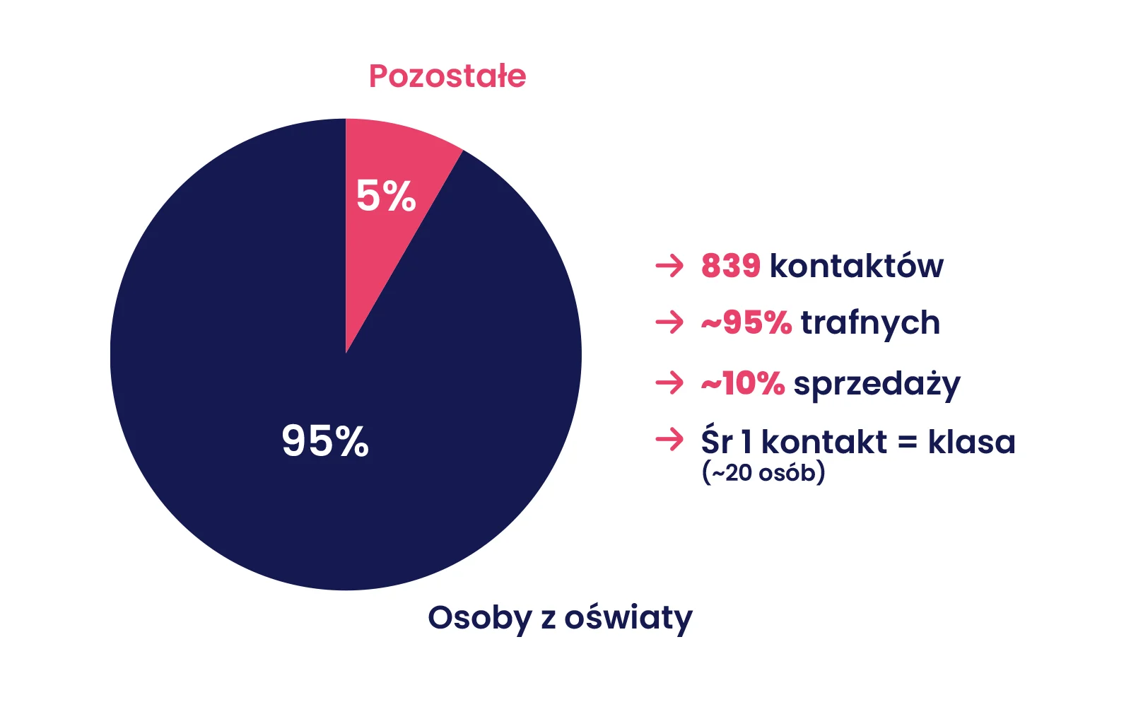 W ciągu miesiąca pozyskaliśmy 839 kontaktów do osób związanych z oświatą, z których ok. 10% kończyło się sprzedażą – najczęściej biletów dla całych klas.